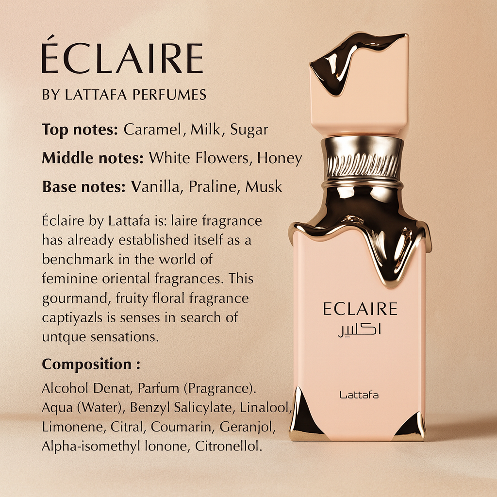 - Eclaire de Lattafa Perfumes est un parfum Floral Fruité Gourmand pour femme. Les notes de tête sont Caramel, Lait et Sucre; les notes de coeur sont Miel et Fleurs blanches; les notes de fond sont Vanille, Praliné et Musc.
